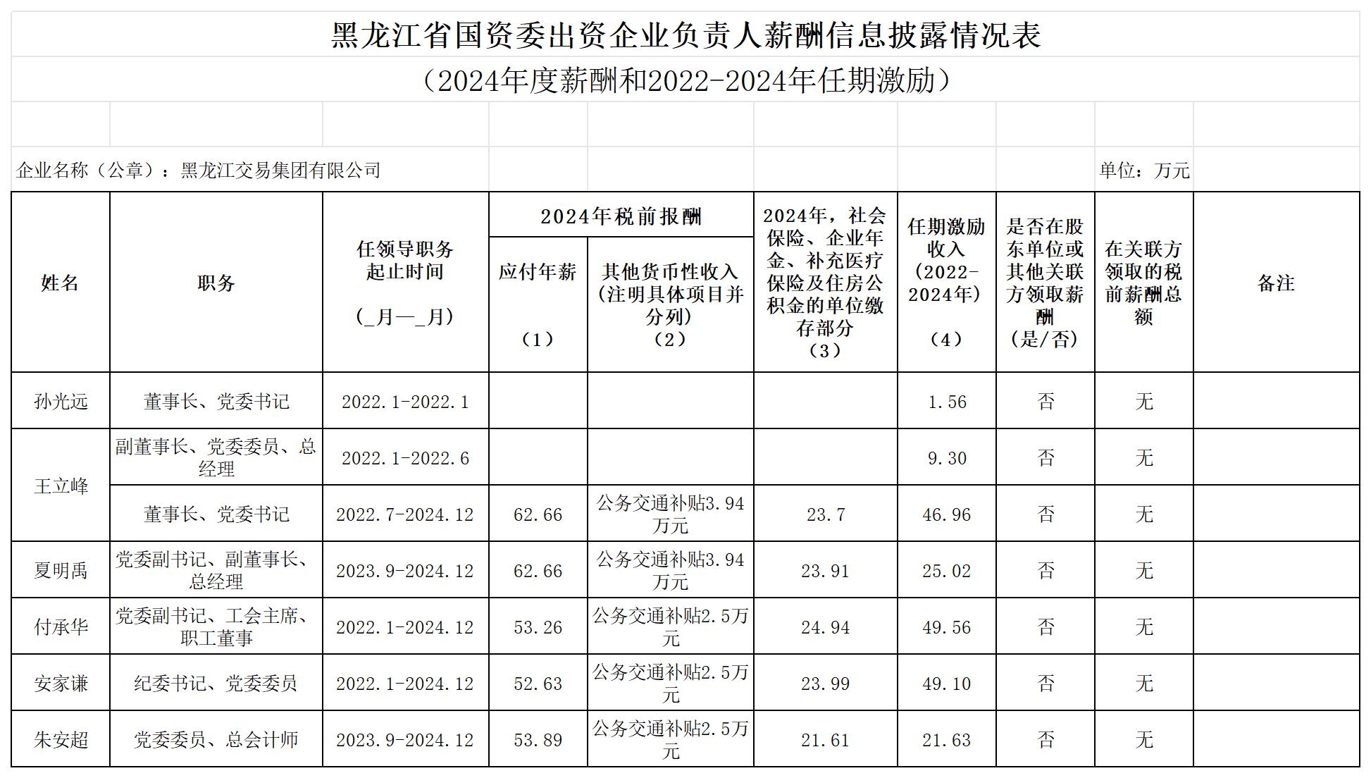 按照《黑龍江省國資委出資企業(yè)負責人薪酬管理辦法》黑國資分〔2016〕202號文件精神,黑龍江交易集團有限公司對由省國資委管理的領(lǐng)導班子成員2024年度薪酬和2022-2024年任期激勵信息向社會披露如下。