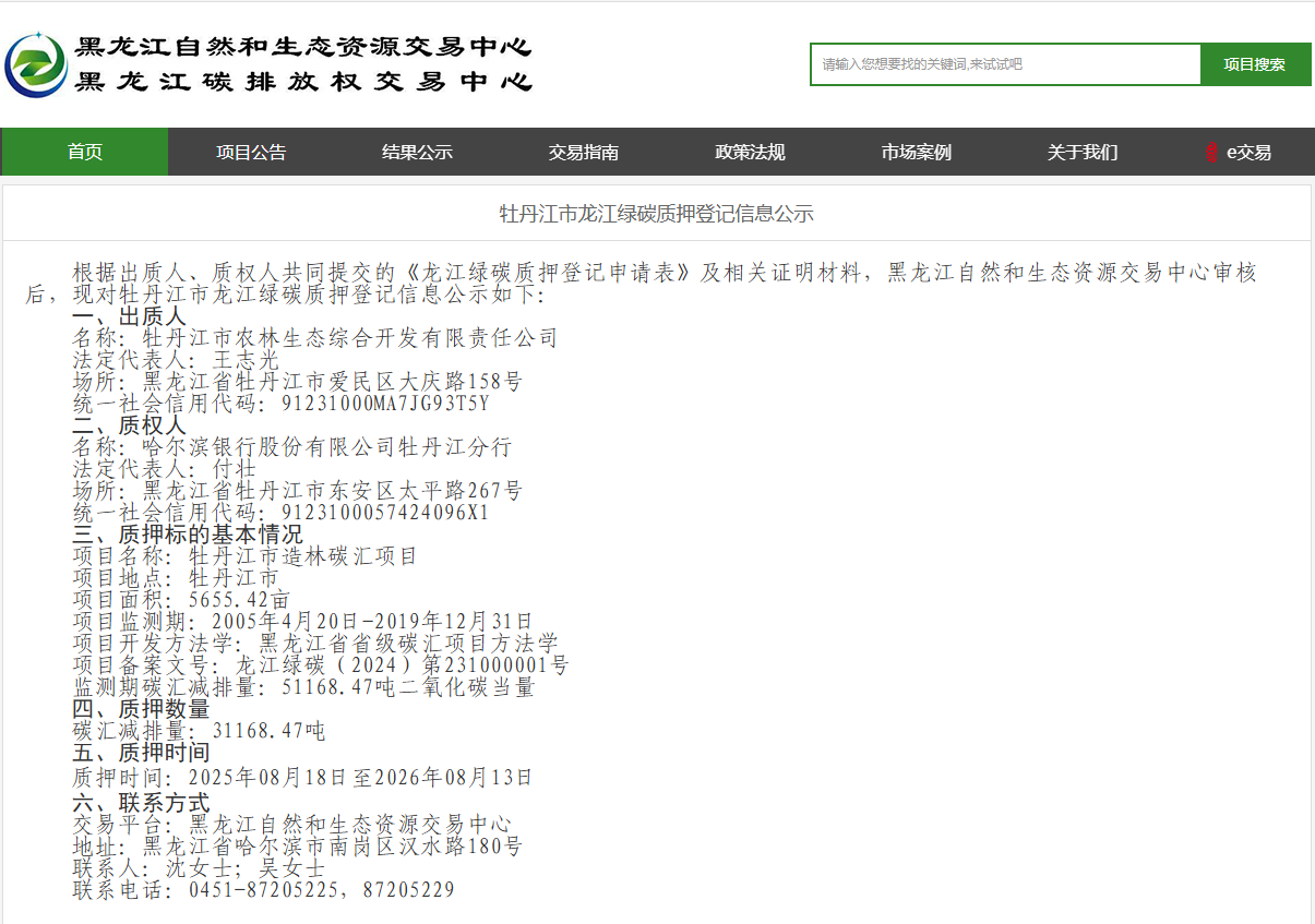 黑龍江自然和生態(tài)資源交易中心辦理完成全省首宗龍江綠碳質押貸款登記業(yè)務,借貸雙方通過自然生態(tài)交易中心平臺實施龍江綠碳凍結功能,公示相關質押信息,融資額1000萬元,打通了以“碳匯+金融”盤活碳匯存量資產的新模式,進一步拓寬了龍江綠碳價值實現渠道。